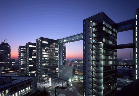 | Auftraggeber: DeTeImmobilien und Service GmbH, D-München Kadima, Grundstückgesellschaft mbH & Co. KG, Grünwald FOM, Office Port, D-Heidelberg REAL I.S. AG, D-München Ed. Züblin AG, Stuttgart/München Architekten: Kiessler+Partner Architekten GmbH, München mit Stefan Blume Architekt und Georgios Rebouskos Architekt, München Landschaftsarchitekten: Valentien + Valentien, Wessling Ingenieure: Sailer Stepan und Partner, IB Lehner GmbH, München Ed. Züblin AG, Stuttgart/München Haustechnik: IB Hausladen GmbH, Kirchheim IBF, München IFG, Ehniningen Geschossfläche: 96.000 qm Zeitraum: 1998-2005 Fotos: Stefan Müller-Naumann |